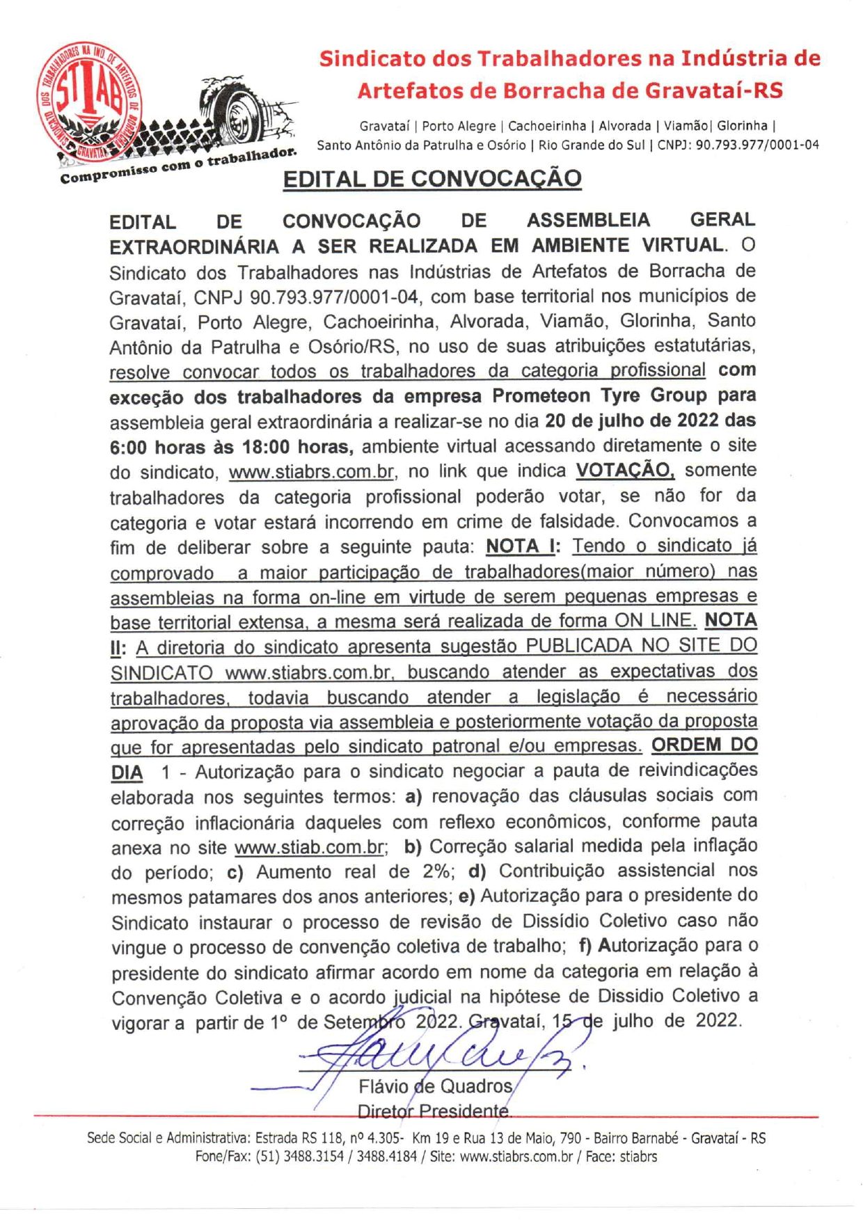 A diretoria do Sindicato da Borracha de Gravataí convoca todosos Trabalhadores